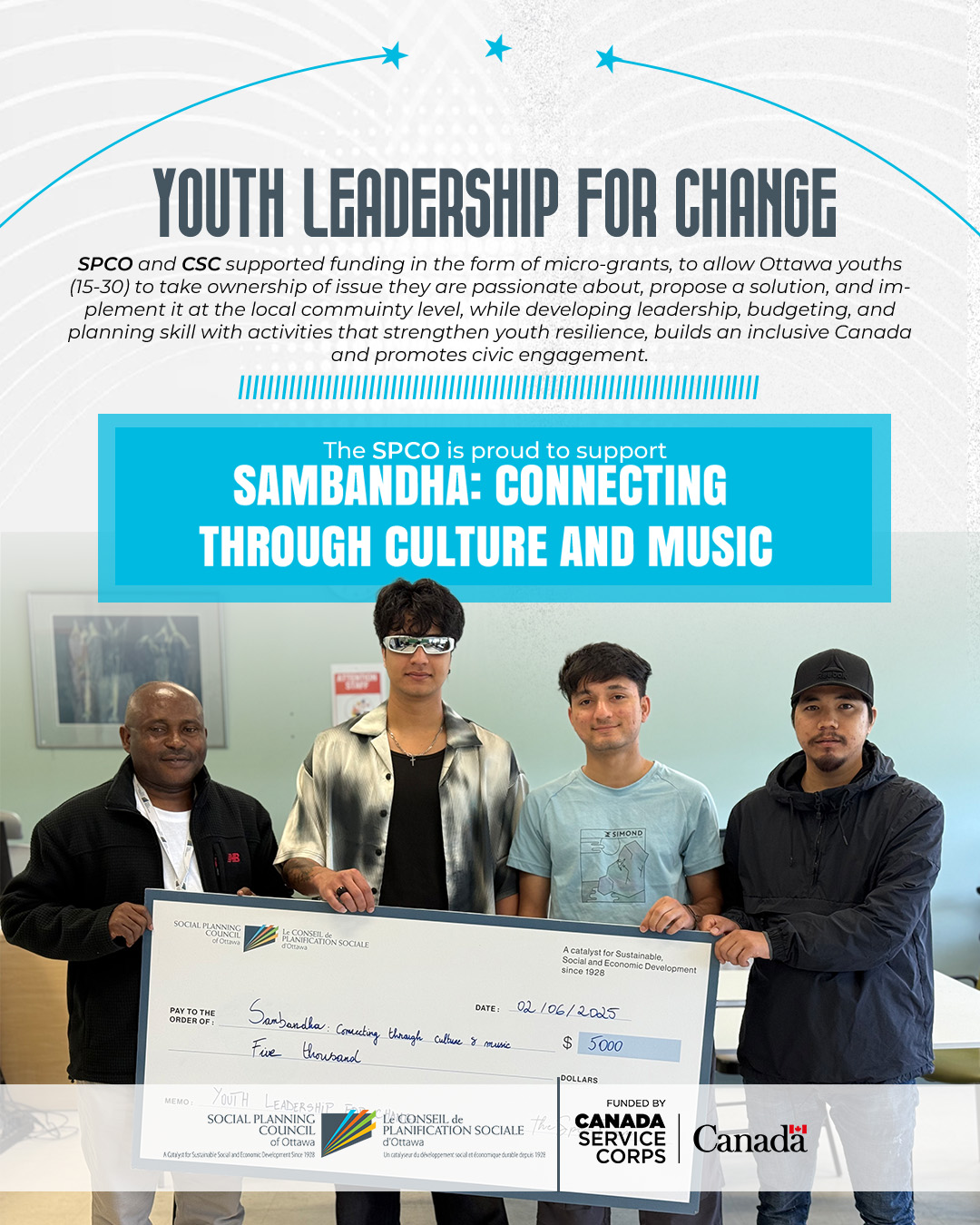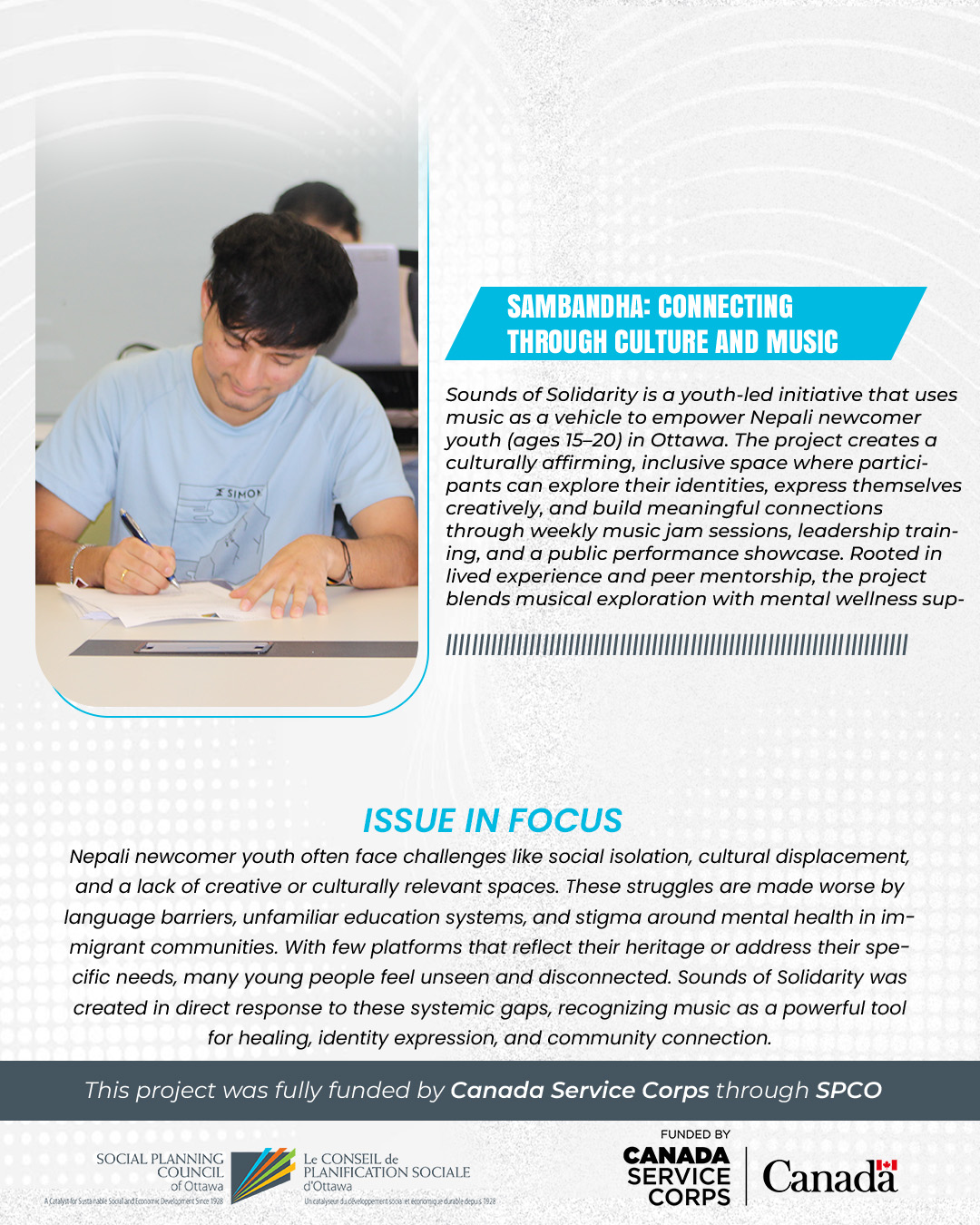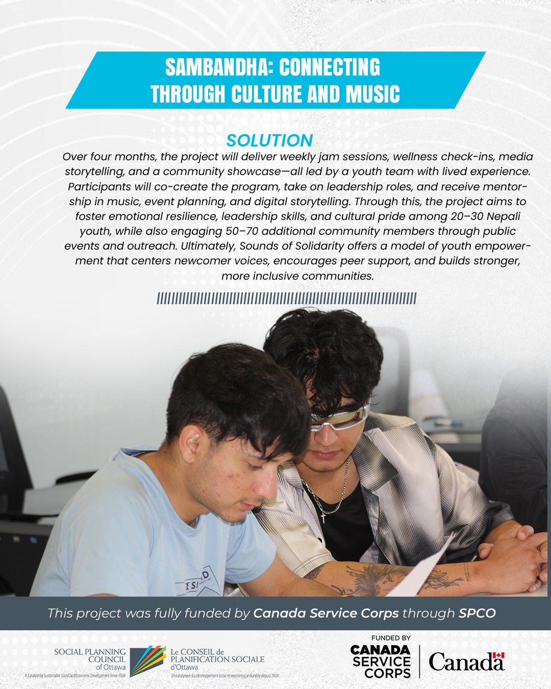 Sounds of Solidarity is a youth-led initiative that uses music as a vehicle to empower Nepali newcomer youth (ages 15–20) in Ottawa. The project creates a culturally affirming, inclusive space where participants can explore their identities, express themselves creatively, and build meaningful connections through weekly music jam sessions, leadership training, and a public performance showcase. Rooted in lived experience and peer mentorship, the project blends musical exploration with mental wellness support to help youth develop confidence, leadership, and a strong sense of belonging.