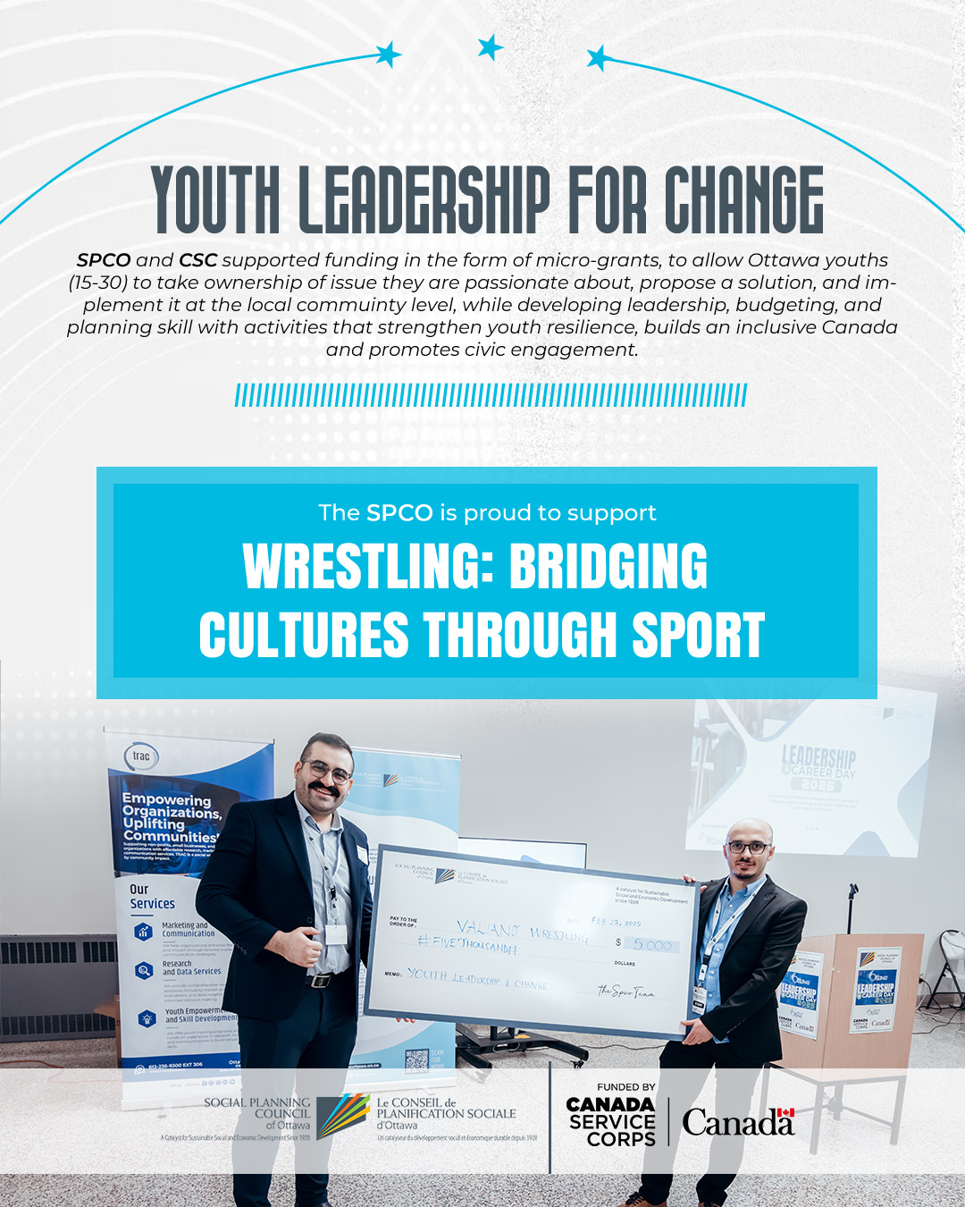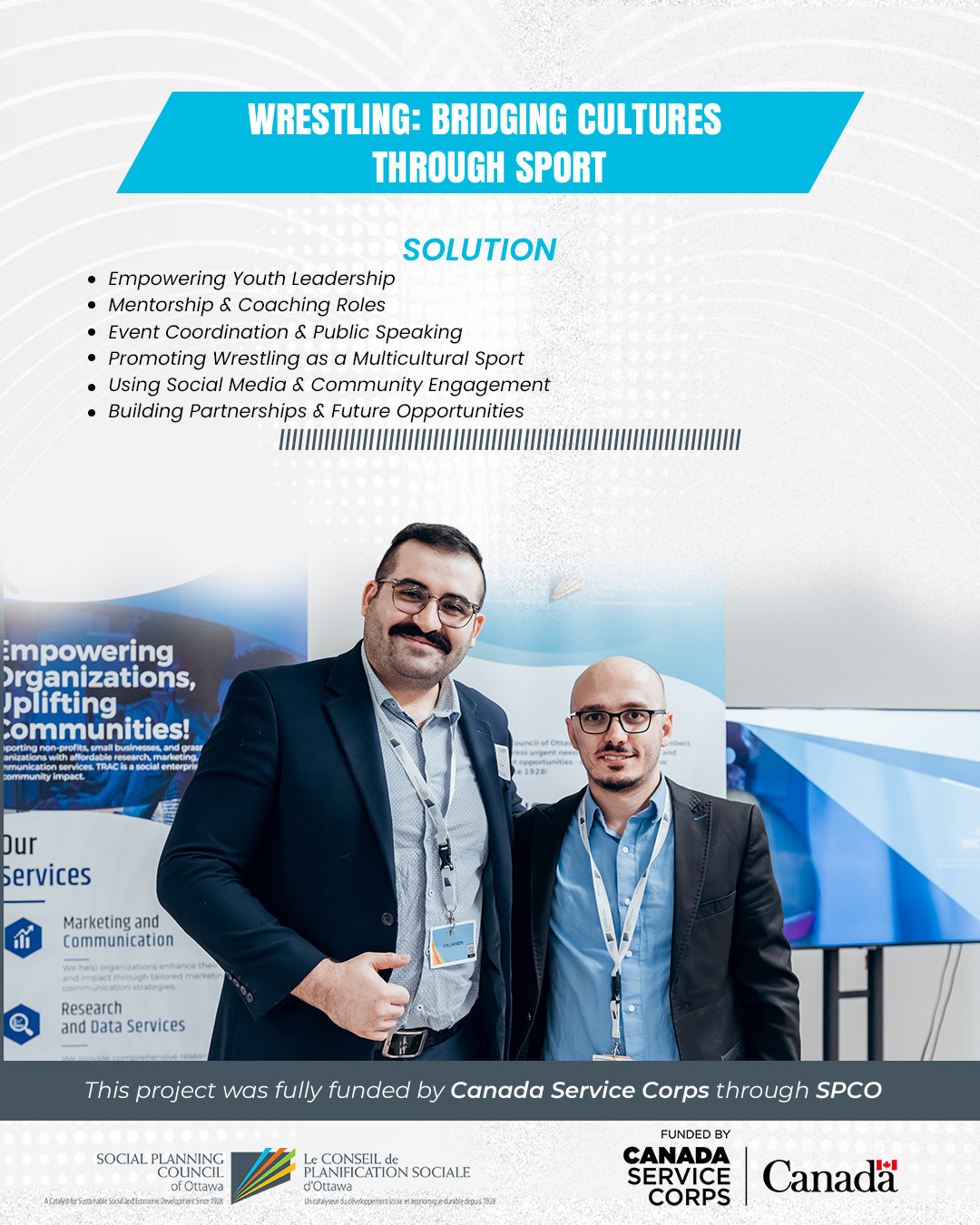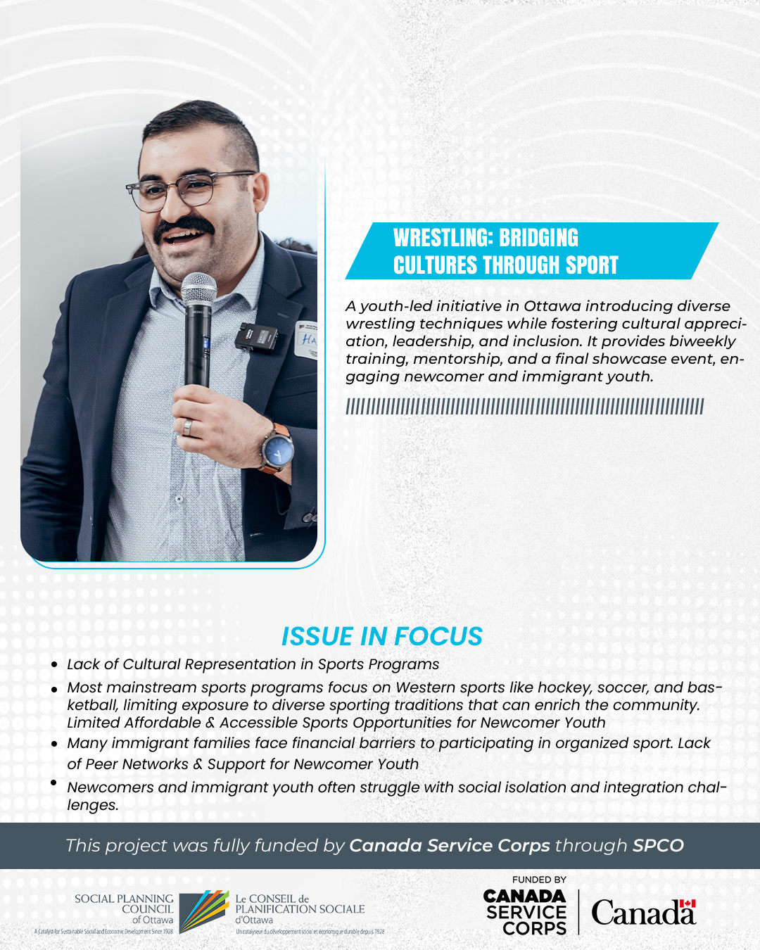 “Wrestling: Bridging Cultures Through Sport” is a youth-led program offering free biweekly wrestling sessions that blend traditional techniques from different cultures. Led by young volunteer wrestlers, the project teaches discipline, teamwork, and resilience while creating an inclusive space for newcomer and Canadian-born youth. Beyond training, it fosters mental wellness, cultural appreciation, and community connection, culminating in a public showcase event celebrating youth achievements.
