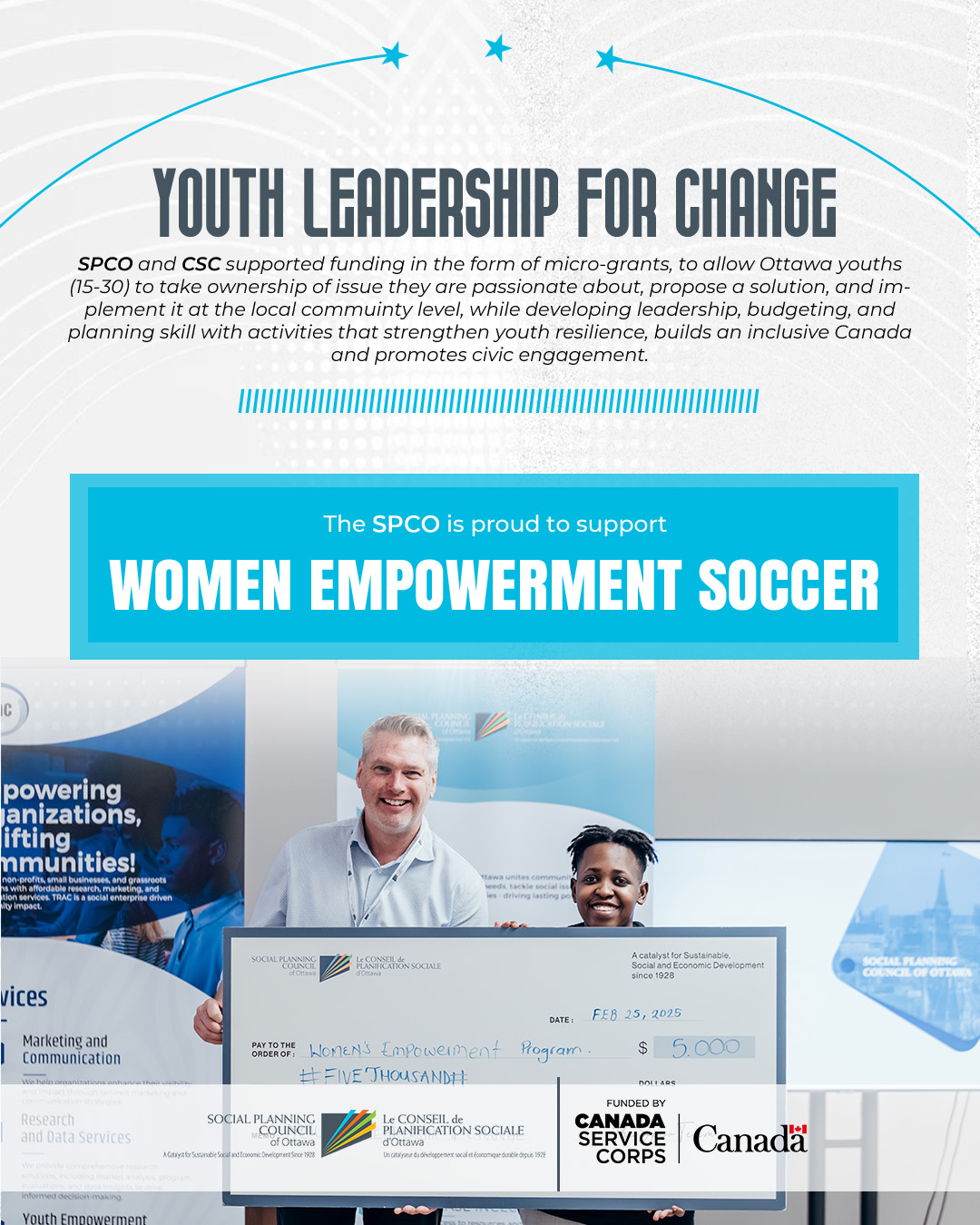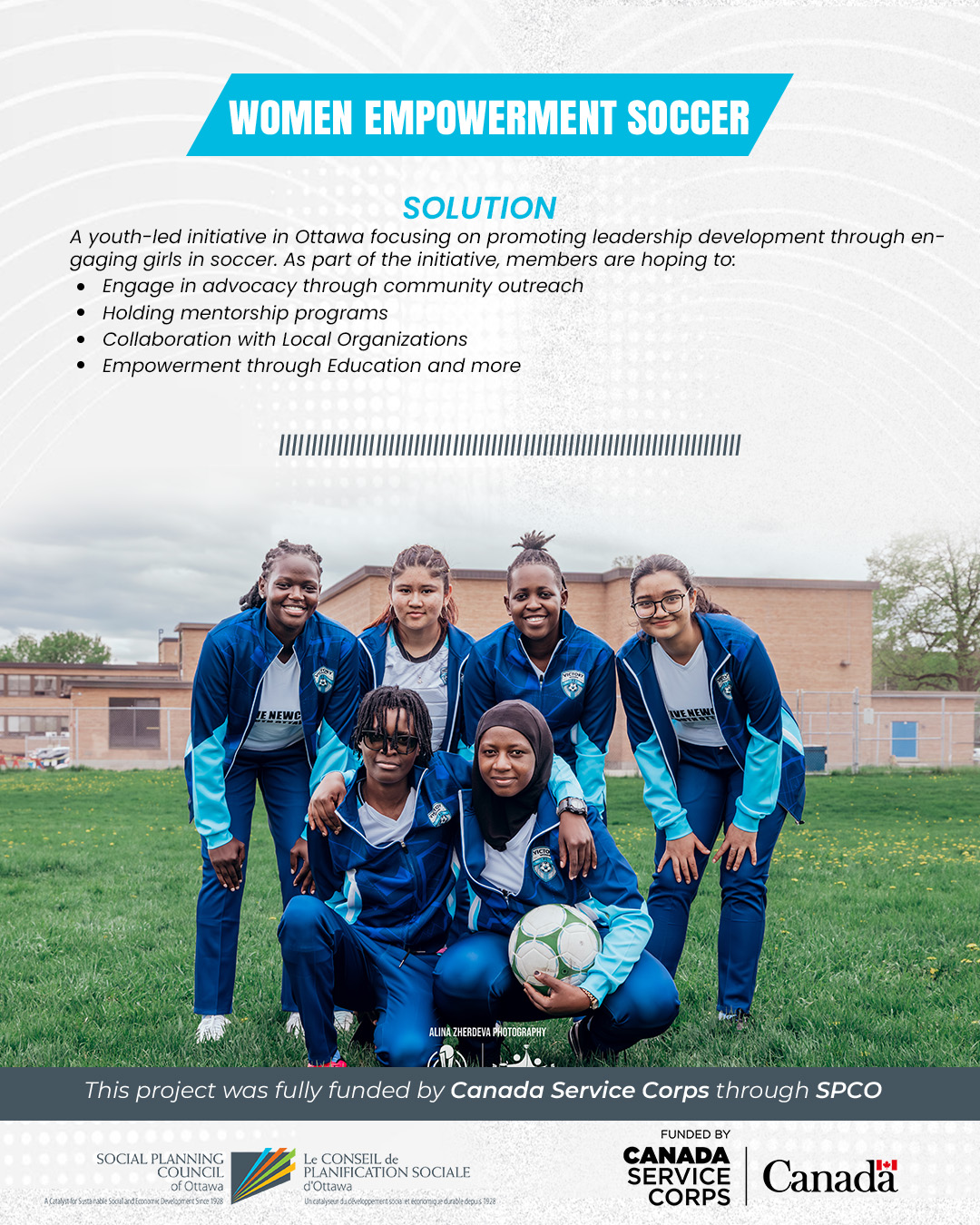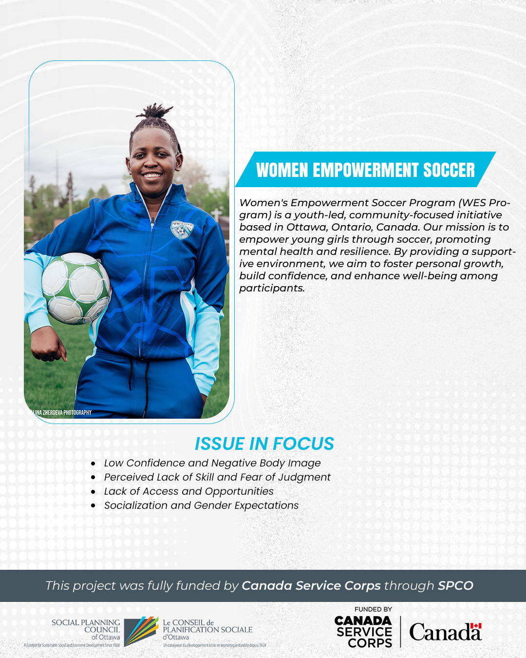 The Women’s Empowerment Soccer Program (WES Program) is a youth-led initiative in Ottawa using soccer to boost confidence, mental health, and resilience in young girls. Through free training sessions, friendly matches, and workshops, participants gain skills in teamwork, leadership, and self-advocacy. By creating a safe and inclusive space, the program helps girls build confidence both on and off the field.