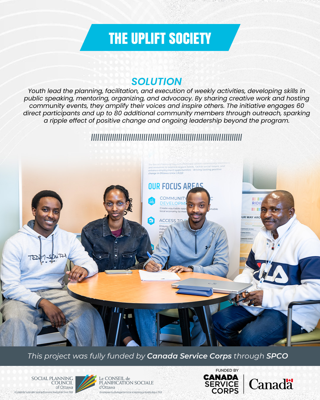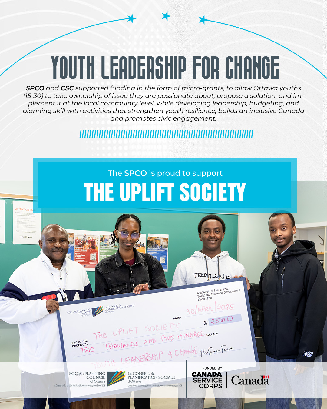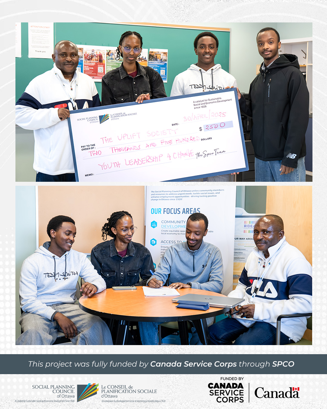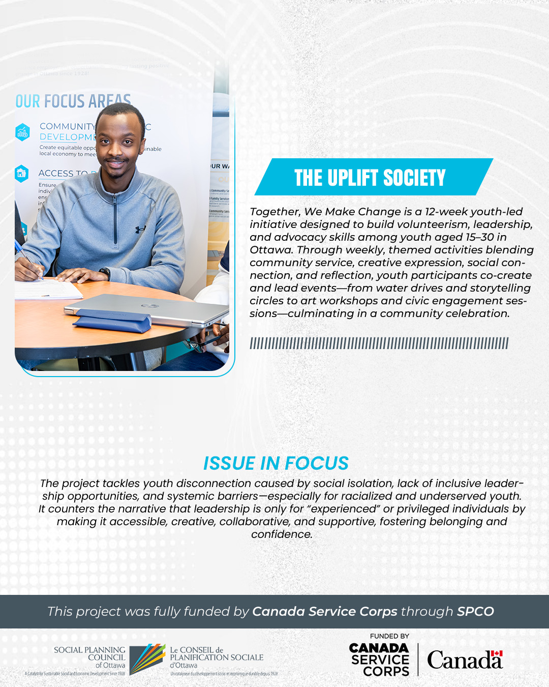 Together, We Make Change is a 12-week youth-led initiative designed to build volunteerism, leadership, and advocacy skills among youth aged 15–30 in Ottawa. Through weekly, themed activities blending community service, creative expression, social connection, and reflection, youth participants co-create and lead events—from water drives and storytelling circles to art workshops and civic engagement sessions—culminating in a community celebration.