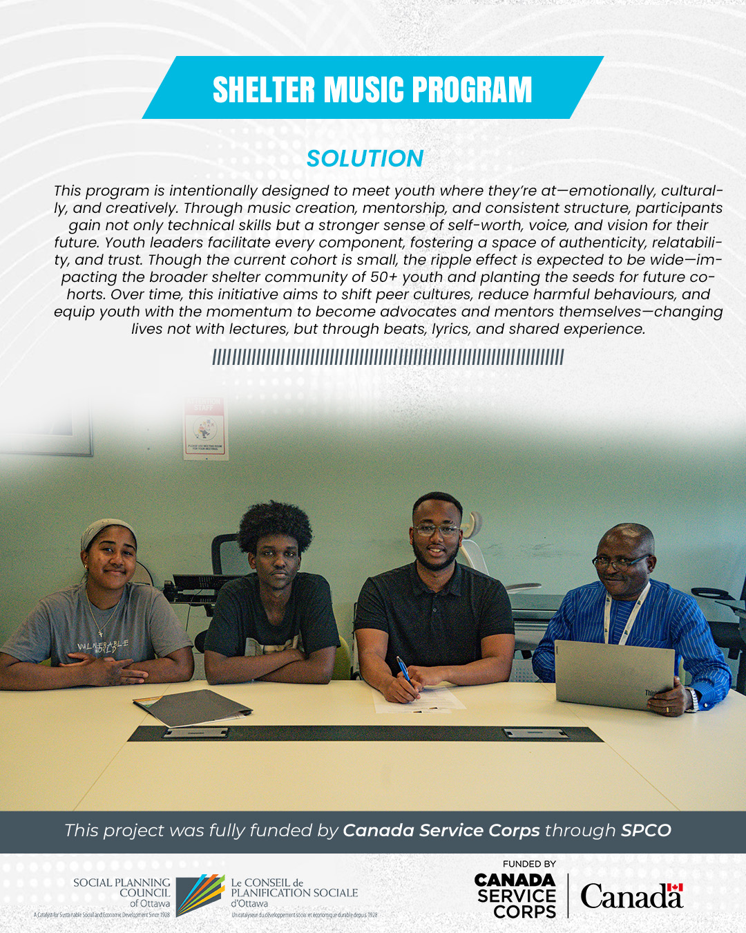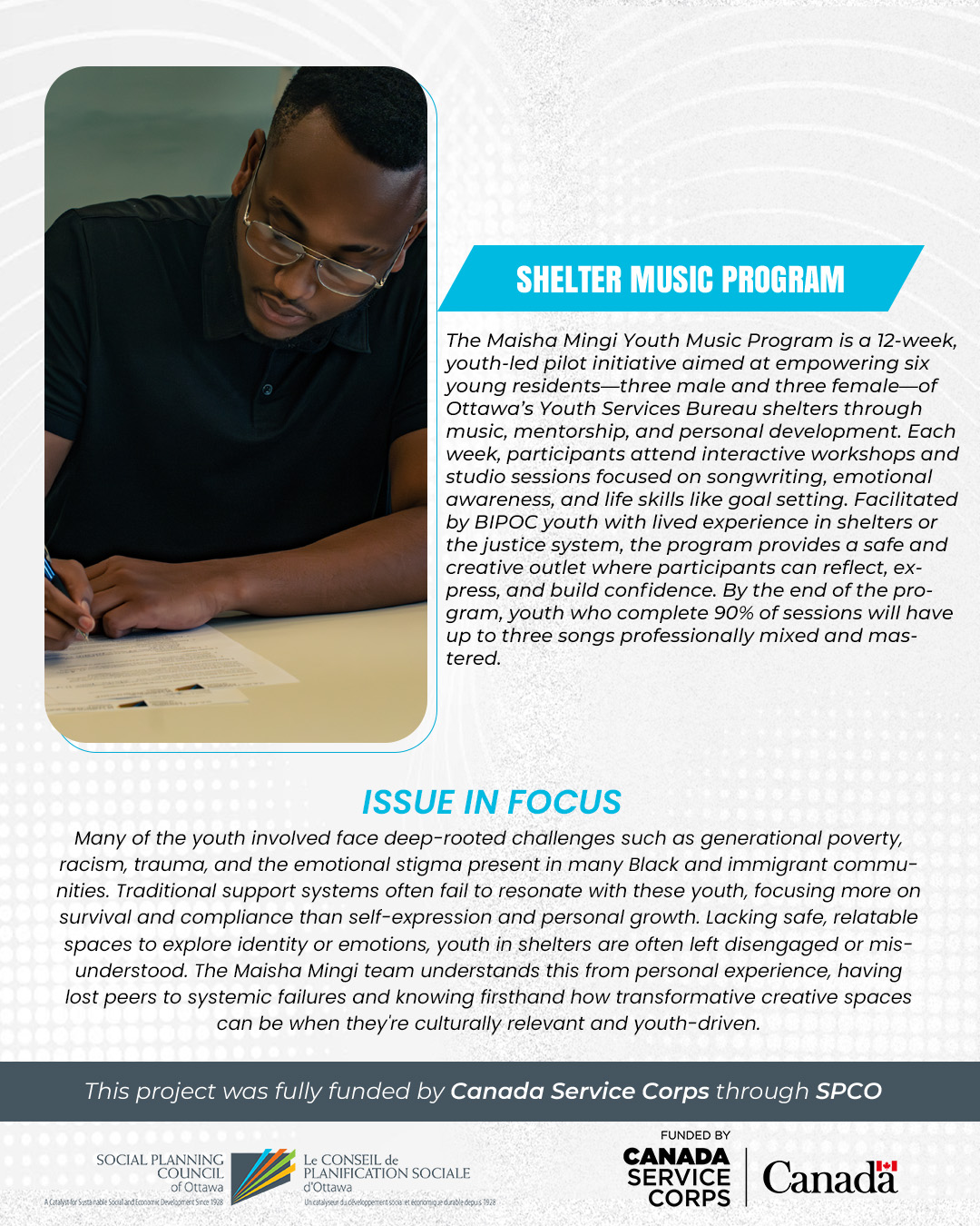 The Maisha Mingi Youth Music Program is a 12-week, youth-led pilot initiative aimed at empowering six young residents—three male and three female—of Ottawa’s Youth Services Bureau shelters through music, mentorship, and personal development. Each week, participants attend interactive workshops and studio sessions focused on songwriting, emotional awareness, and life skills like goal setting. Facilitated by BIPOC youth with lived experience in shelters or the justice system, the program provides a safe and creative outlet where participants can reflect, express, and build confidence. By the end of the program, youth who complete 90% of sessions will have up to three songs professionally mixed and mastered.
